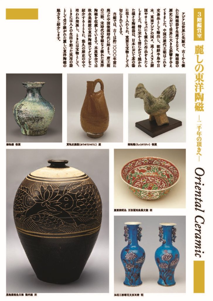 当館では、古くは約2000年前に興った中国後漢時代に始まり、唐王朝の三彩、宋時代の青磁など優れた東洋陶磁を収蔵しています。本展覧会では秋水美術館の東洋陶磁コレクションをご紹介するとともに、悠久の歴史の中で培われ発展し、ときには宝物として、ときには人々の生活を彩った実用の器として受け継がれた東洋陶磁の歴史とその魅力をご紹介します。